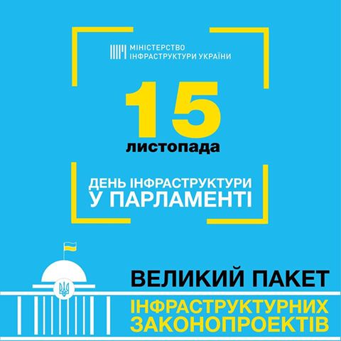 «У зв’язку із завантаженим порядком денним у Верховні Раді розгляд Великого пакету інфраструктурного законодавства у парламенті було перенесено з 3 на 15 листопалда. Це була пропозиція народних депутатів, з якою ми погодилися. Важливо, щоб день інфраструктури відбувся саме в листопаді. Ми всі законопроекти готували спільно з народними депутатами на майданчику Міністерства інфраструктури і вони відкриті, крім того, під час кожного пленарного засідання я відвідую всі фракції, пояснюю, доношу думку про те, для чого вони потрібні – це не просто папірці, це реальні ключі до зовнішніх інвестицій, до створення нових робочих місць в Україні, до повернення України до європейського порядку денного», - зазначив Володимир Омелян.