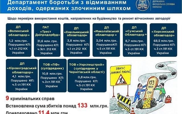 Загальна сума збитків – понад 133 млн. гривень та донараховано до сплати 11, 4 млн. гривень. Типові порушення посадових осіб – це залучення до виконання державних замовлень підприємств з ознаками «фіктивності», значне завищення вартості будівництва, матеріалів, ремонту та обслуговування доріг і оформлення безтоварних операцій з придбання товарів або послуг.
