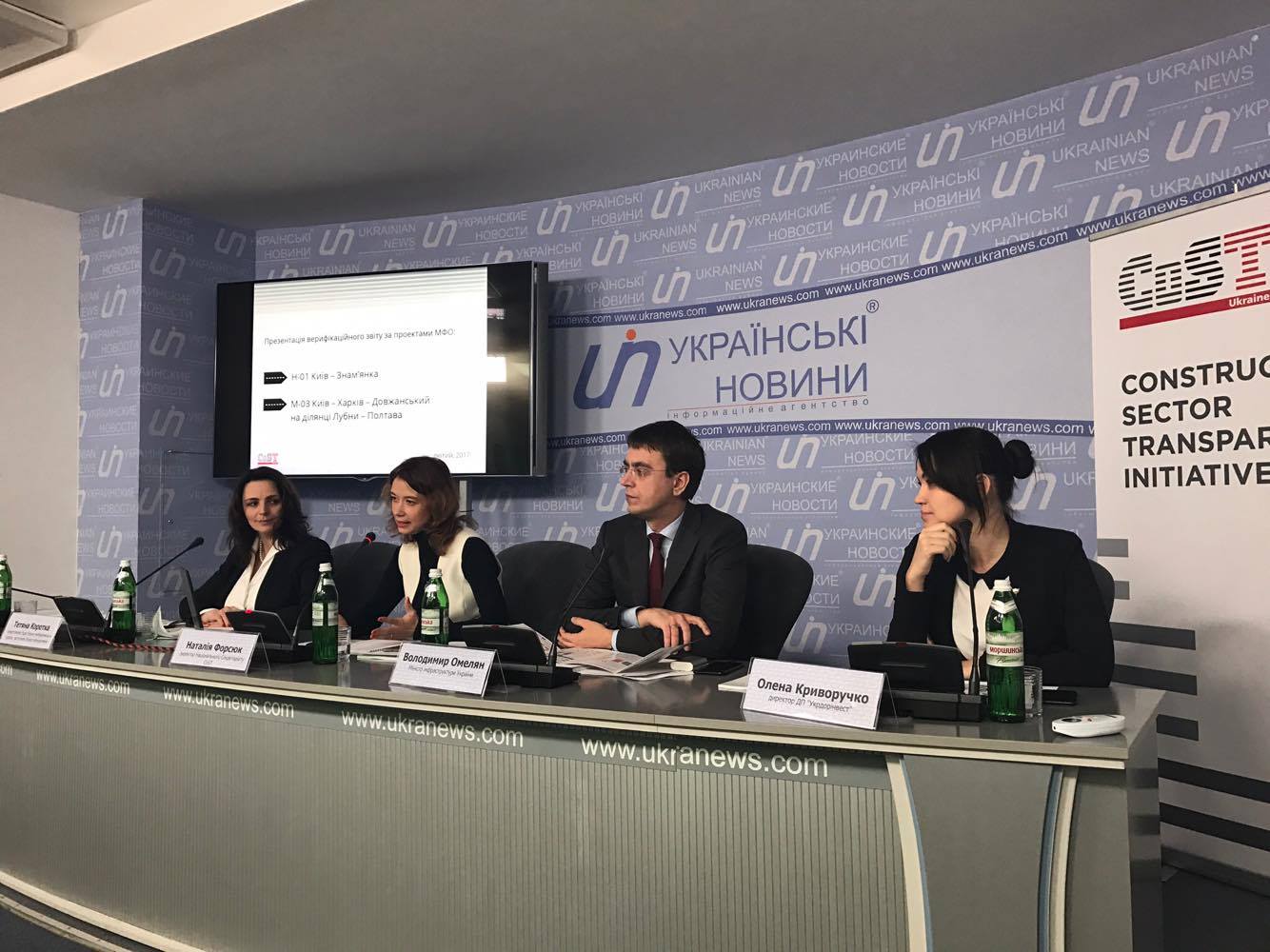 Звіт Ініціативи CoST Ukraine присвячений результатам моніторингу дорожніх проектів в Україні, які фінансують Світовий банк, ЄІБ та ЄБРР, а саме: капітальний ремонт дороги Н-01 Київ – Знам’янка (планове завершення робіт – 08 квітня 2017 року); реконструкція М-03 Київ – Харків – Довжанський на ділянці Лубни – Полтава (контракт з підрядником було розірвано 23 серпня 2016 року).