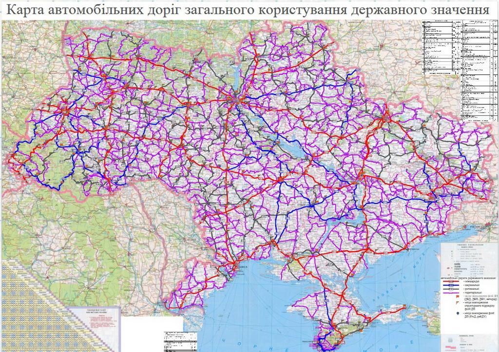 1) Міжнародні автомобільні дороги державного значення (М-01–М-29) – позначені червоним кольором;