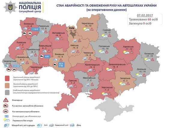 За минулу добу на автошляхах України загинуло дев’ять громадян, травмовано – 66. Сьогодні, 8 лютого, у деяких регіонах обмежено рух транспорту.