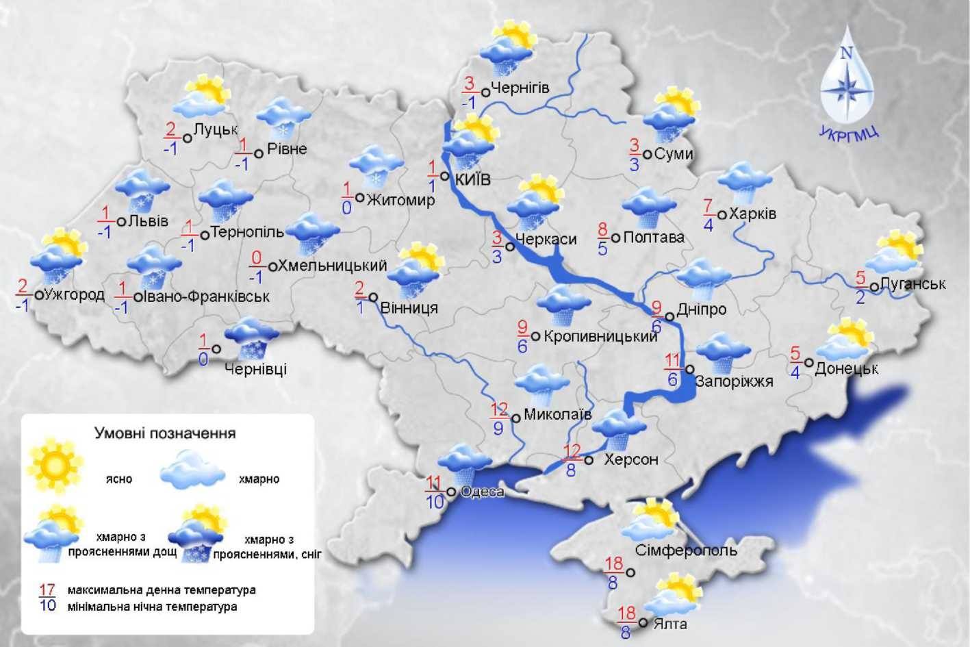 Температура у західних, північних, Вінницькій та Черкаській областях протягом доби від 2° морозу до 3° тепла, в Карпатах 2-7° морозу. На решті території вночі 1-6° тепла, вдень 4-9°. На півдні країни вночі 5-10°, вдень 9-14°.