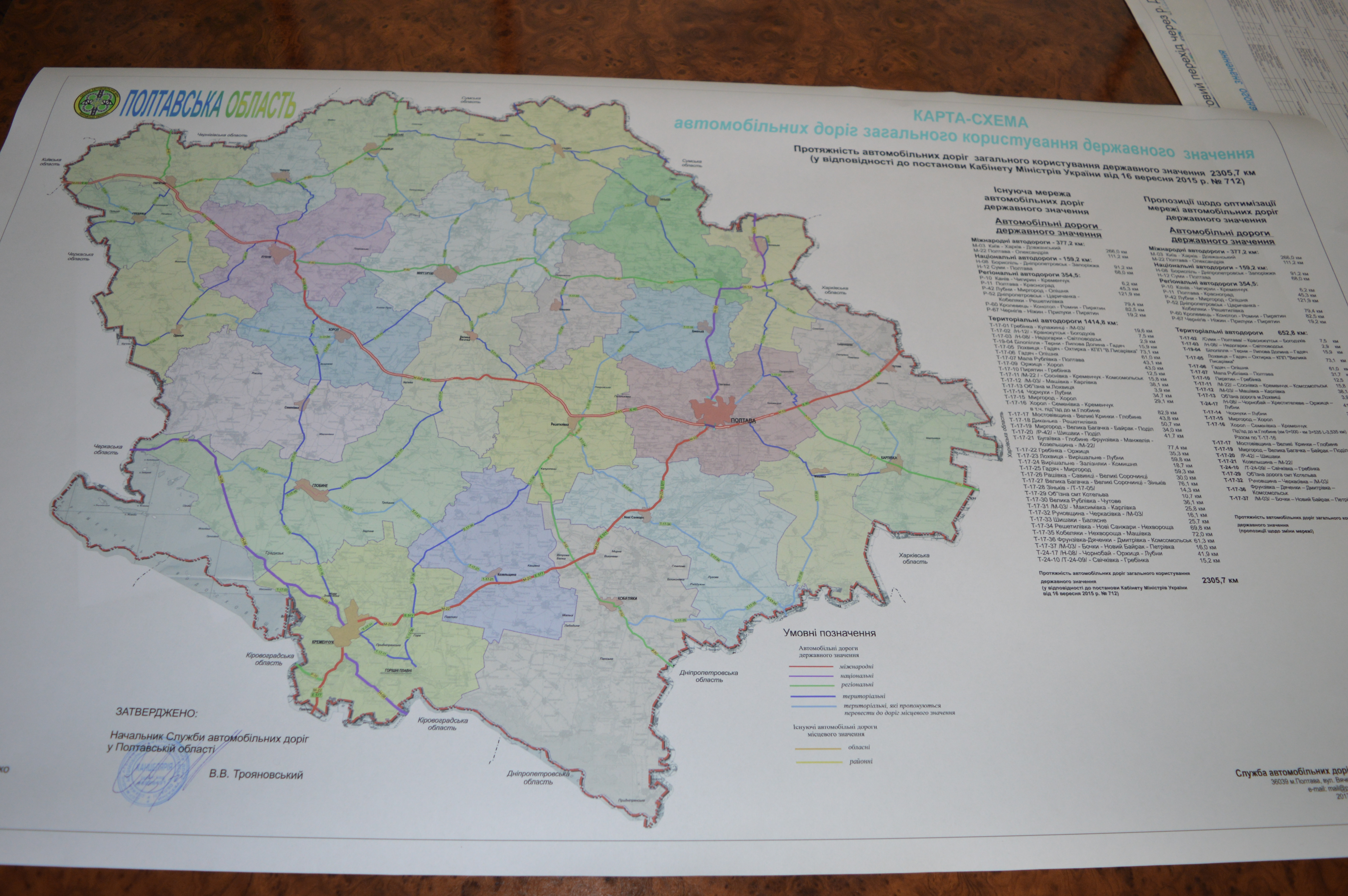 Служба автомобільних доріг презентує попередній варіант оптимізації мережі доріг загального користування. Частину доріг державного значення переводиться у статус місцевих. Таким чином збільшуються права громади на розвиток місцевої інфраструктури. Такі рішення приймаються спільно з Полтавською ОДА.