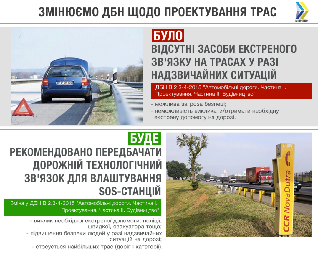 В Україні з 1 вересня 2019 року почнуть діяти зміни до Державних будівельних норм, згідно з якими на трасах міжнародного значення при їх будівництві чи реконструкції, будуть встановлені станції екстреного зв’язку.