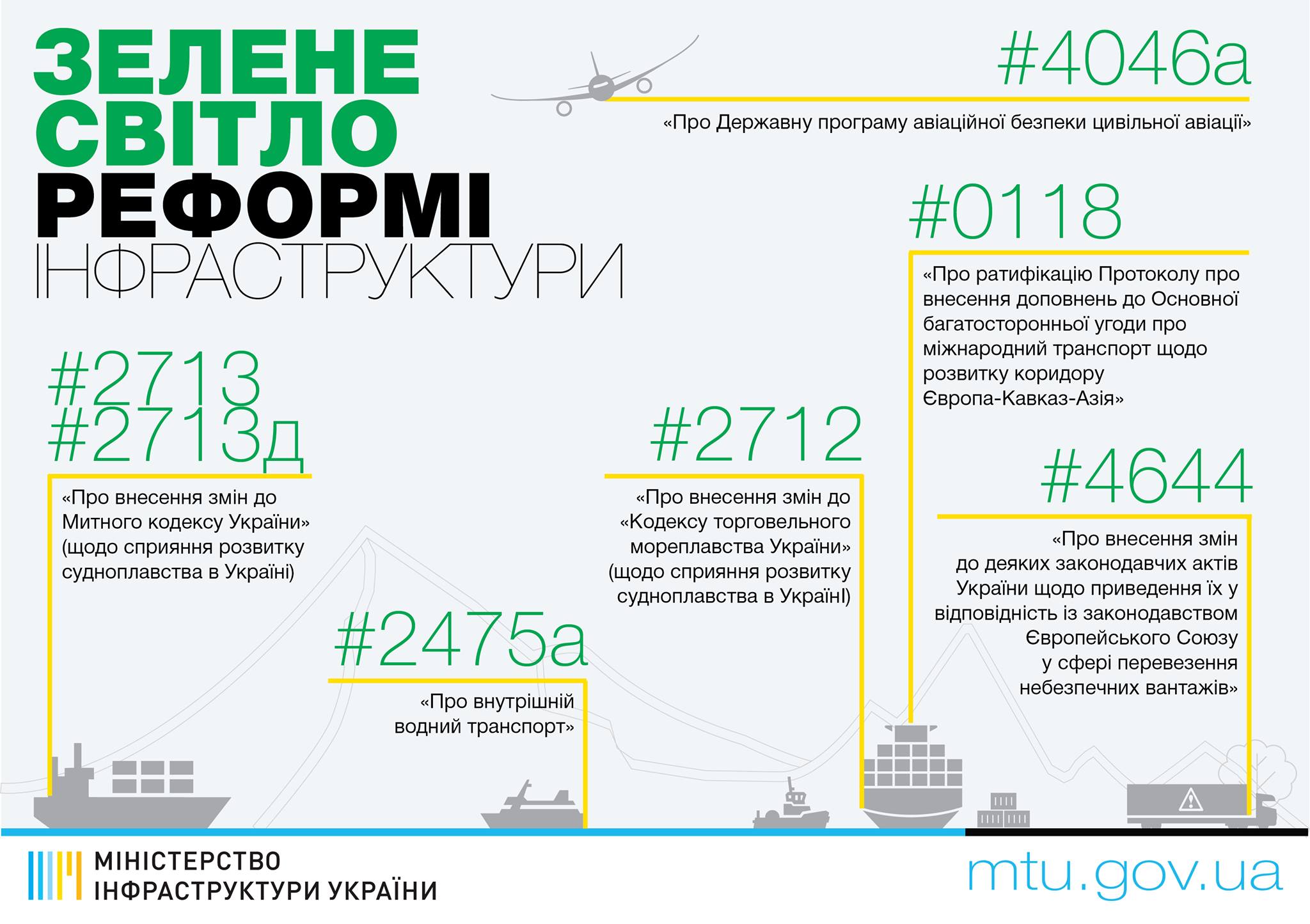 Два законопроекти мають своєю метою розвиток транзиту, зокрема, в рамках коридору Європа-Кавказ-Азія (№0118), а також приведення законодавства України у відповідність до законодавства ЄС у сфері перевезення набезпечних вантажів (№4644).