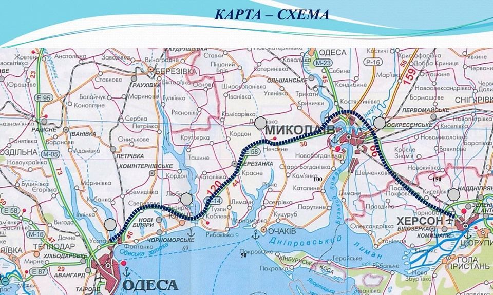 При цьому він прикріпив мапу із схематичним зображенням того, як пролягатиме нове шосе. Так, дорога вестиме від Одеси до Миколаєва, потім огинатиме місто об’їздом та тягнутиметься до Херсона.
